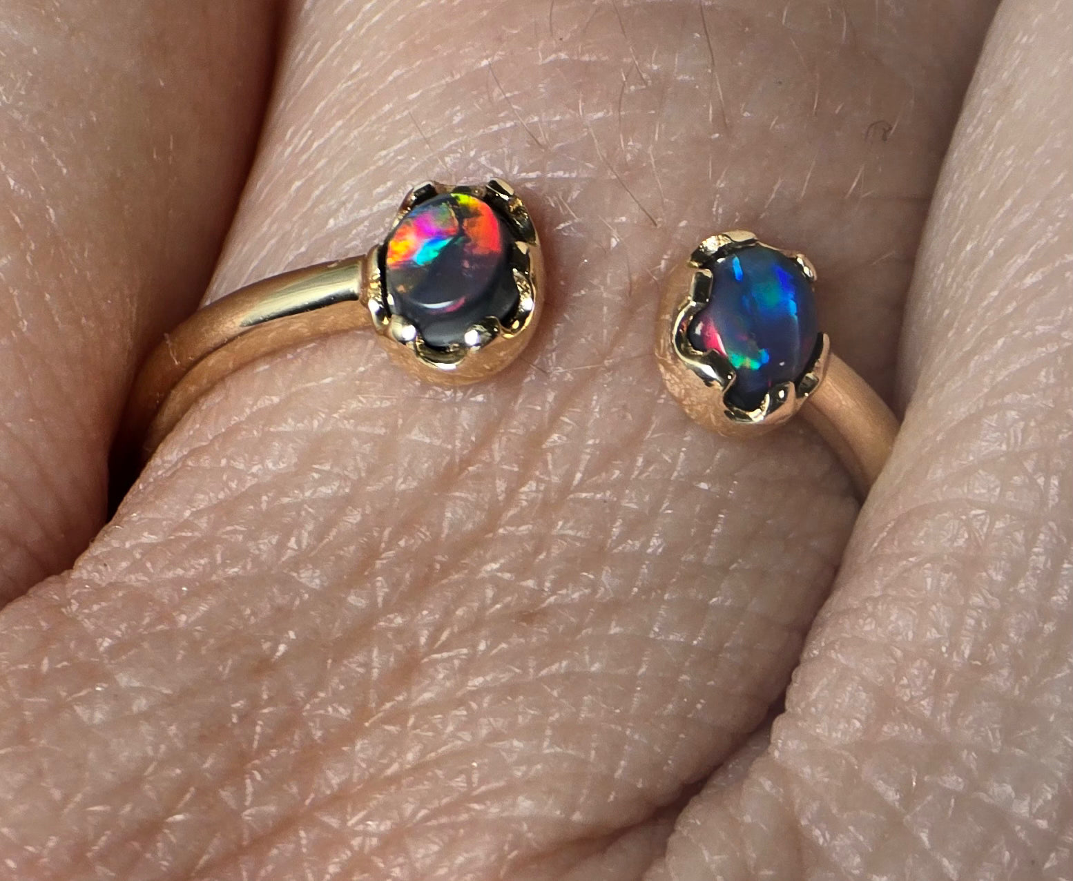 The COOGEE RING is a very well accepted design, Being Adjustable and Stackable, Classy yet simple, featuring TWO natural solid opals from Lightning Ridge and Set in SOLID 14K Yellow Gold.