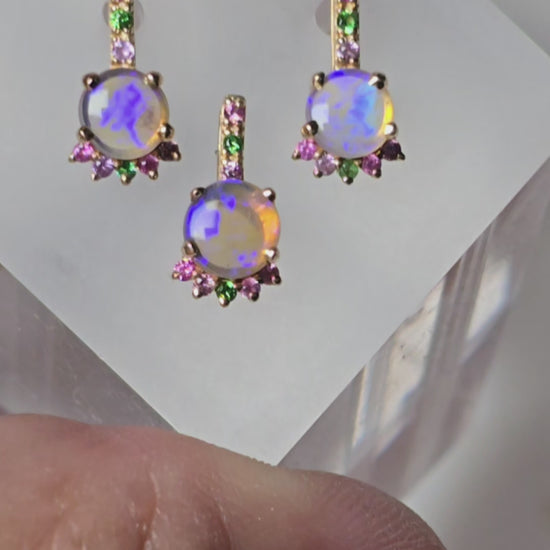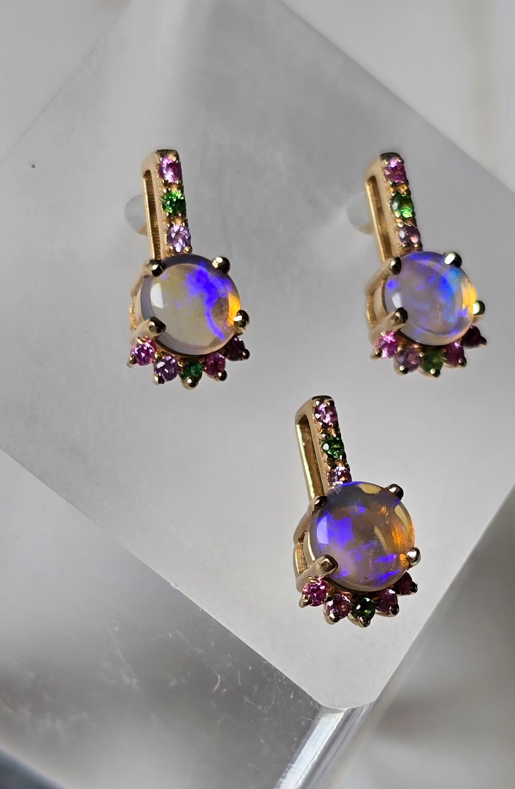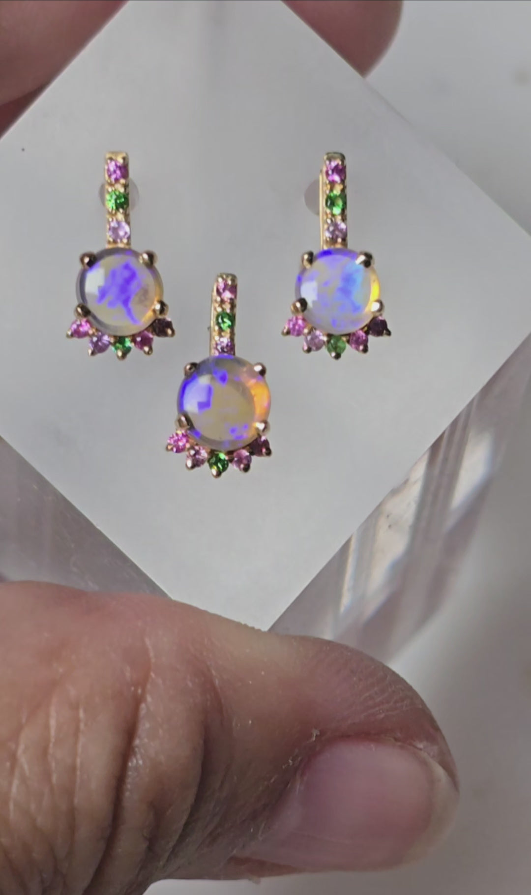 The "Petit" set is a stunning crystal opal pendant and earrings set. Classy yet simple, featuring natural solid crystal opals from Lightning Ridge and Set in SOLID 14K Yellow Gold with Sapphires and Tsavorites as accent stones. The opals are N7 (Transparent) in body tone and B3 in Brightness. The dominant color of the opals is Lavender. Earrings are stud type.