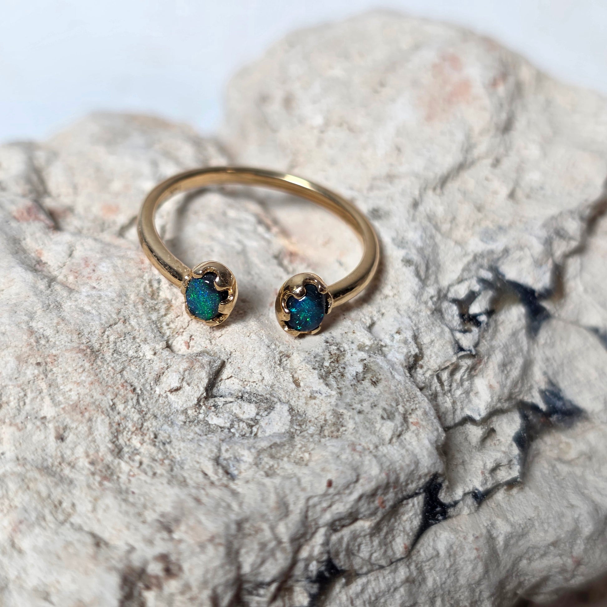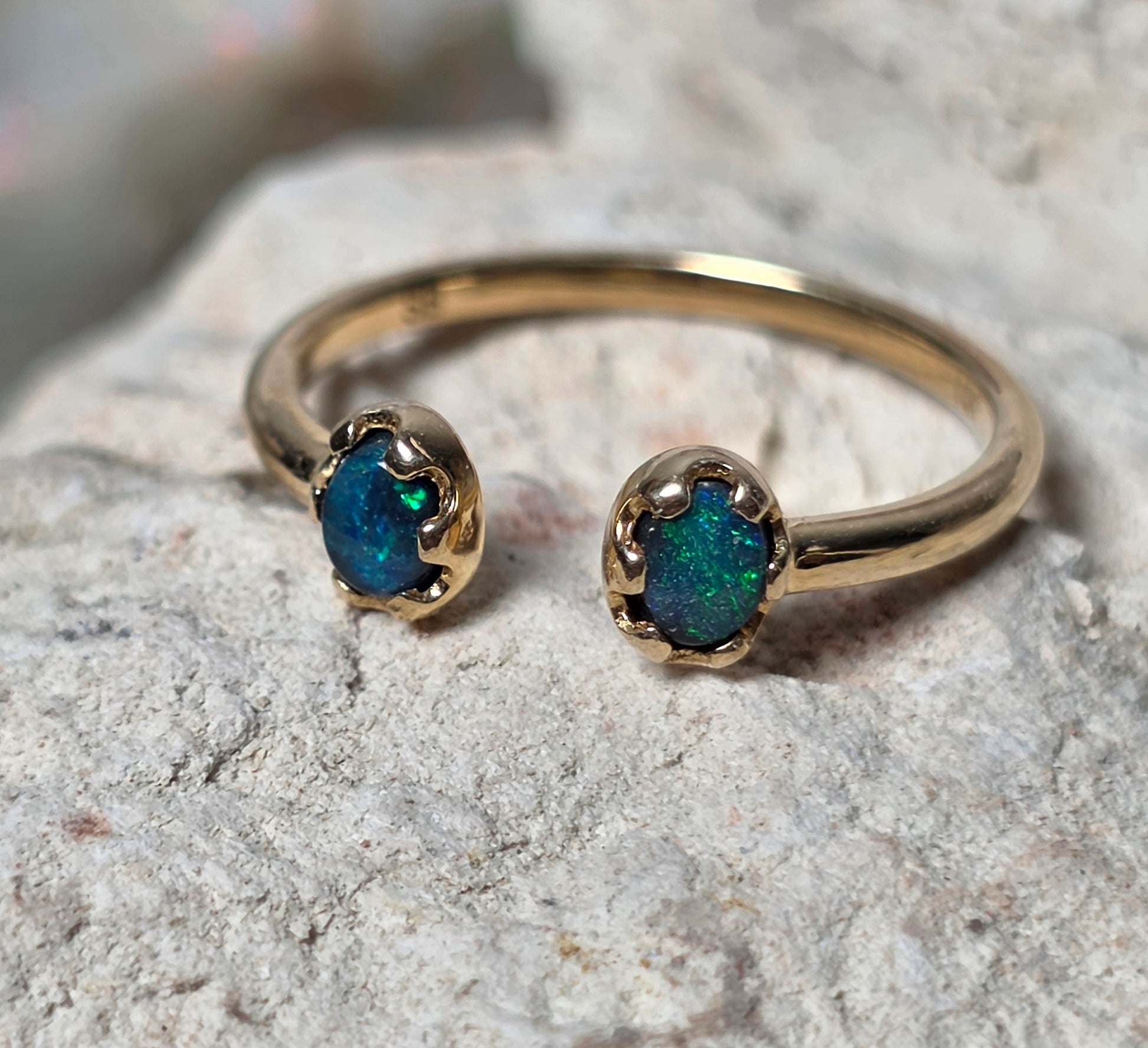 The COOGEE RING is a very well accepted design, Being Adjustable and Stackable, Classy yet simple, featuring TWO natural solid opals from Lightning Ridge and Set in SOLID 14K Yellow Gold.